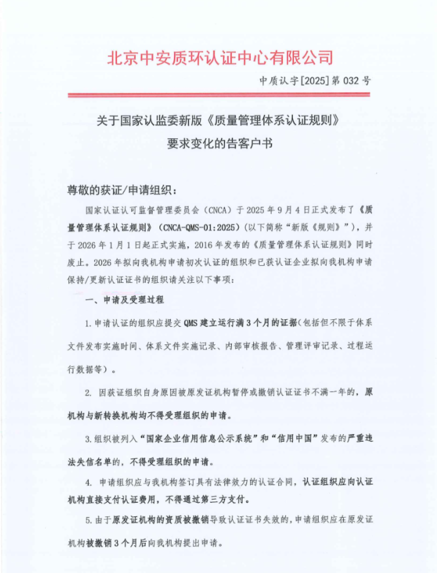 关于国家认监委新版《质量管理体系认证规则》要求变化的告客户书