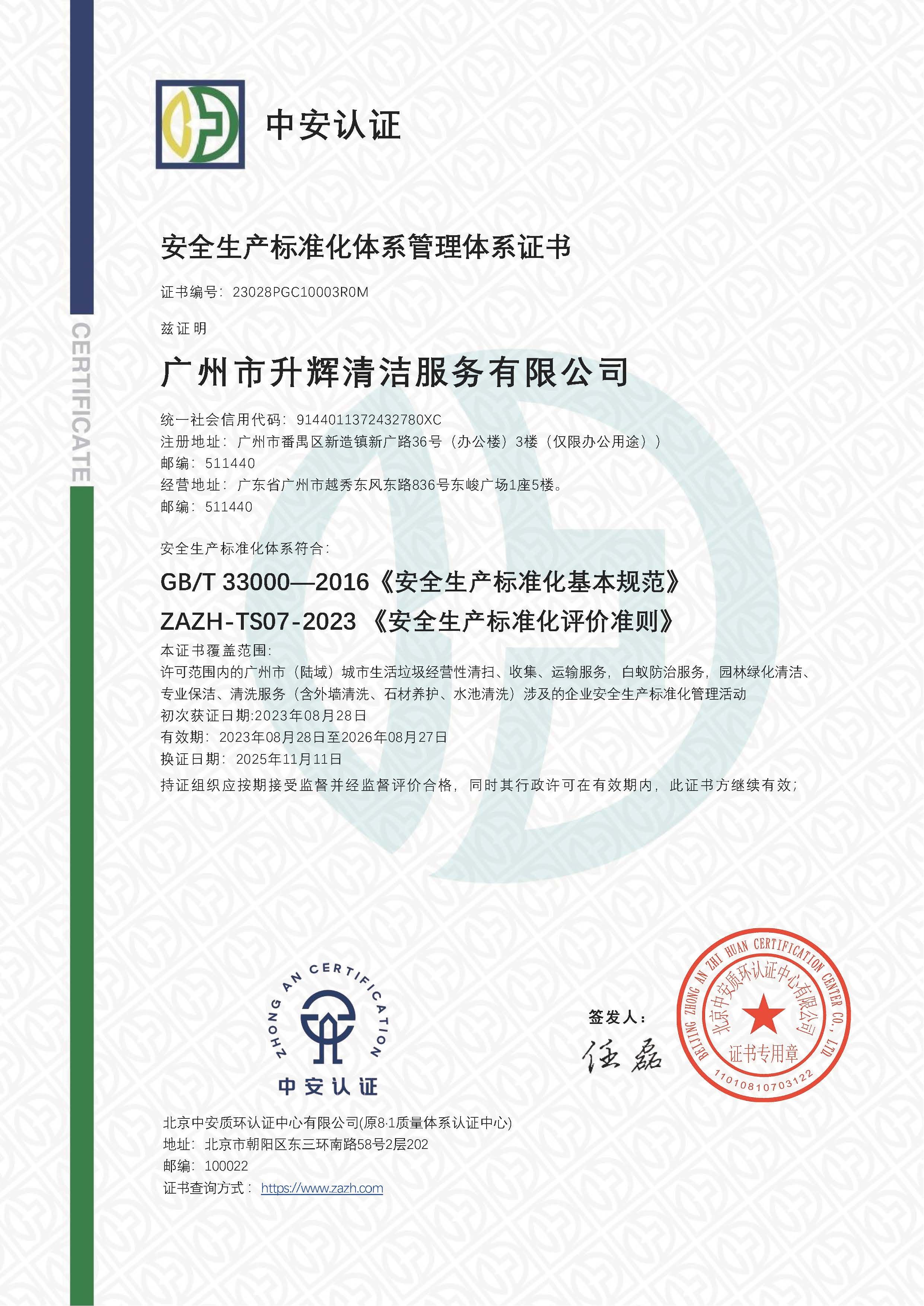 广州市升辉清洁服务有限公司-安全生产标准化体系管理体系证书