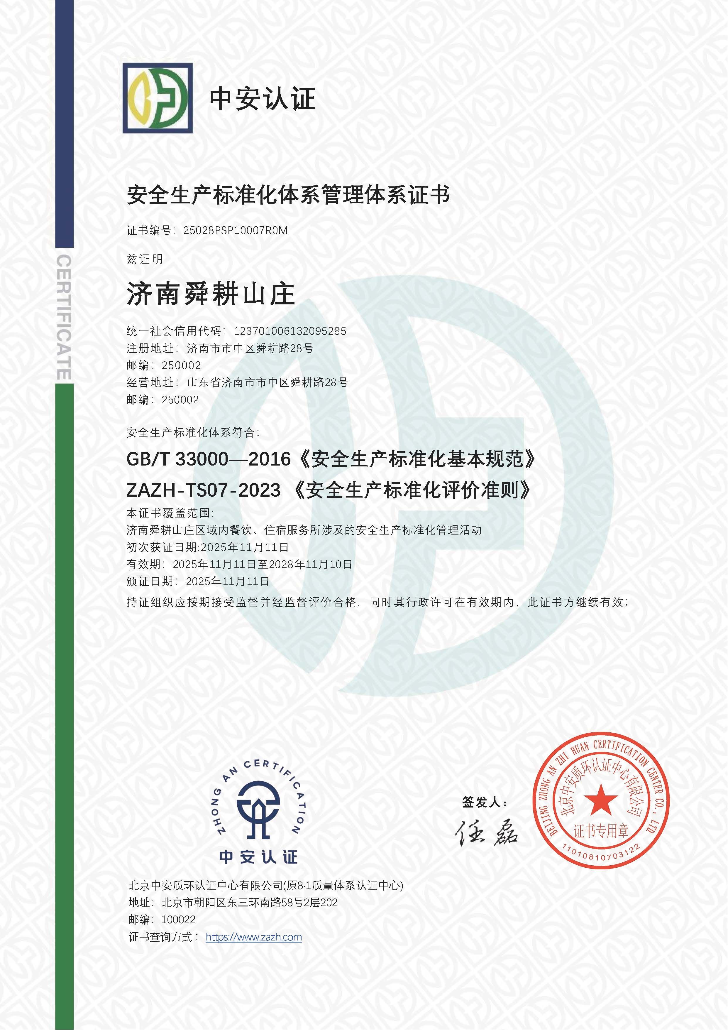 济南舜耕山庄-安全生产标准化体系管理体系证书