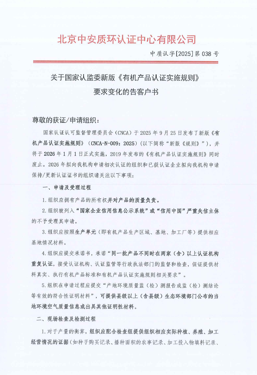 关于国家认监委新版《有机产品认证实施规则》要求变化的告客户书