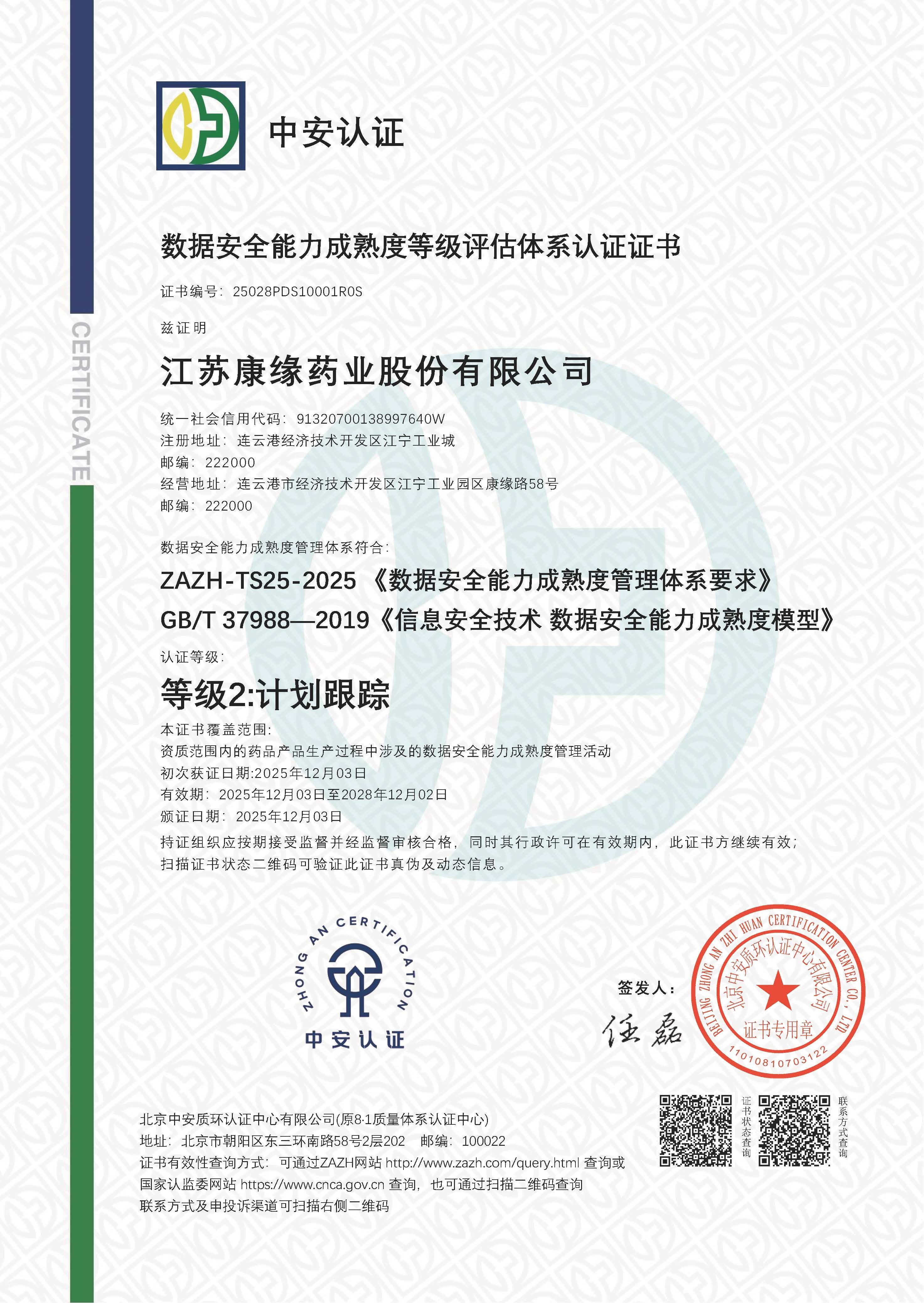 江苏康缘药业股份有限公司-数据安全能力成熟度等级评估体系认证证书
