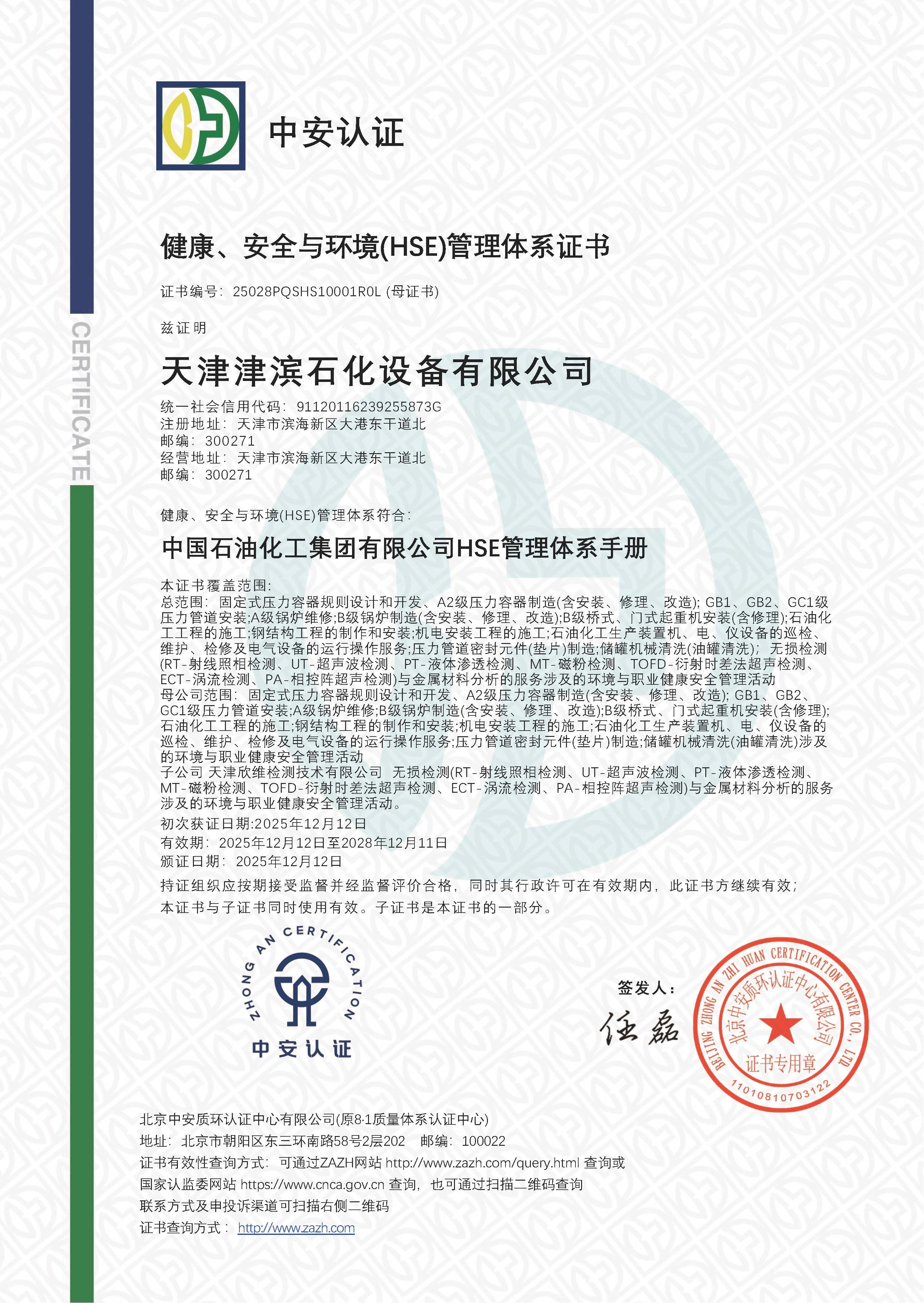 天津津滨石化设备有限公司-健康、安全与环境(HSE)管理体系证书