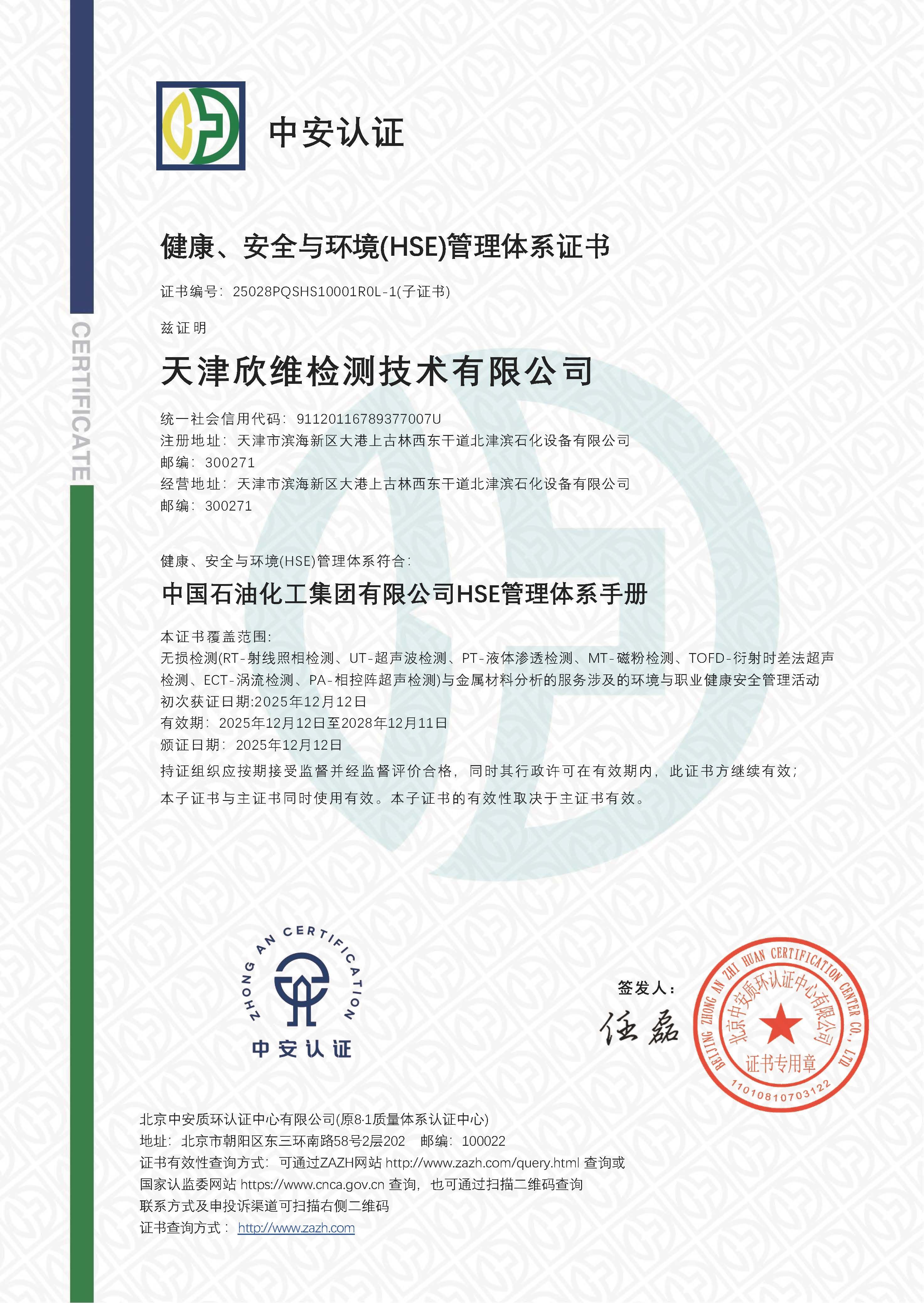 天津欣维检测技术有限公司-健康、安全与环境(HSE)管理体系证书