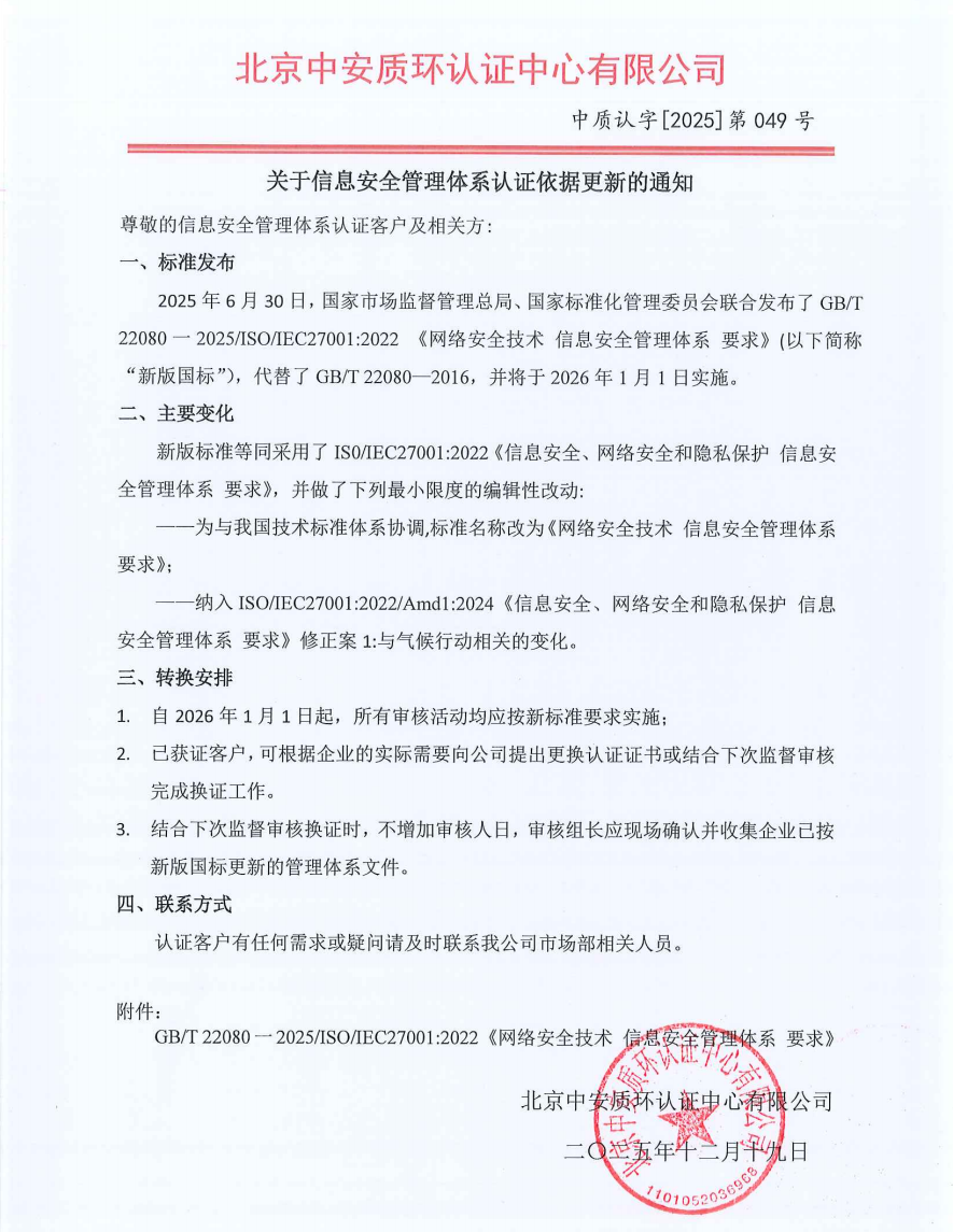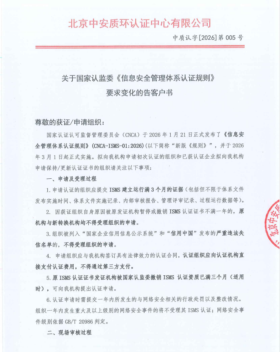 关于国家认监委新版《信息安全管理体系认证规则》要求变化的告客户书