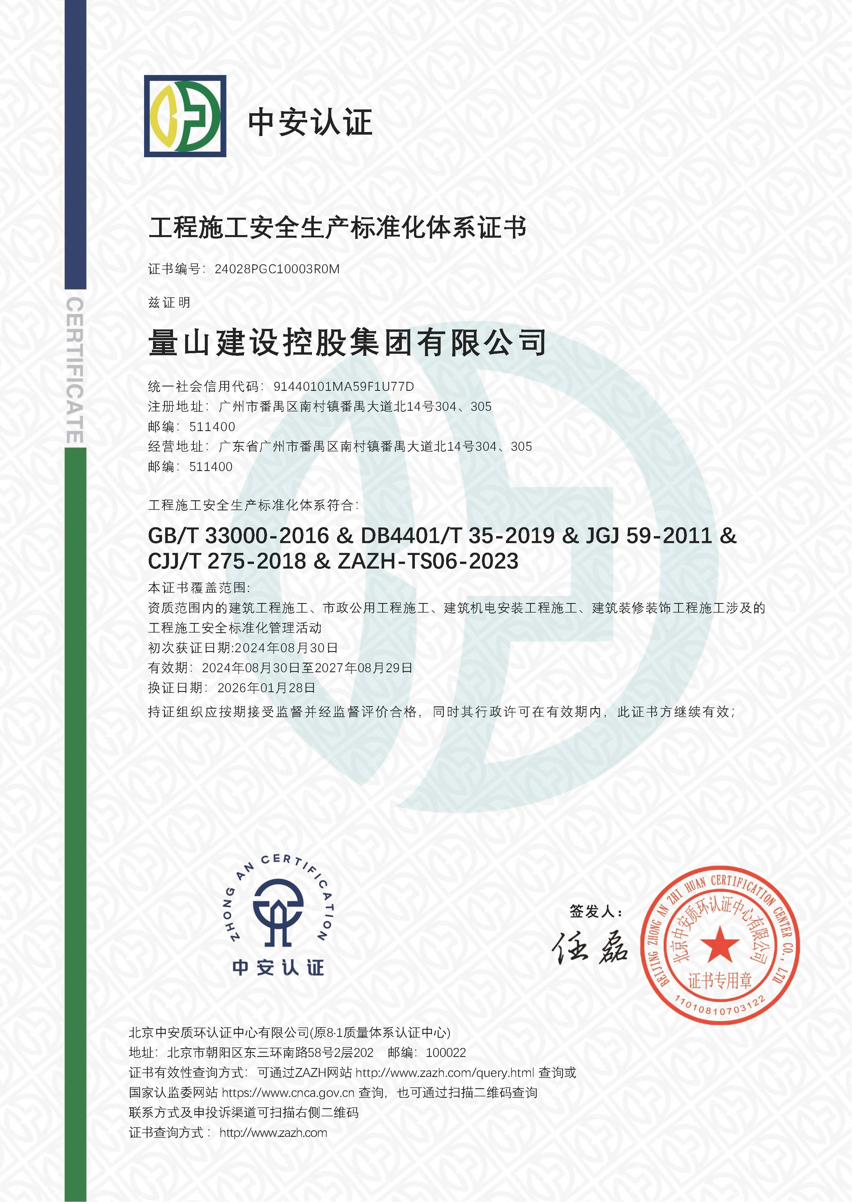 量山建设控股集团有限公司-工程施工安全生产标准化体系证书