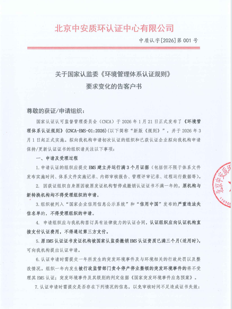 关于国家认监委新版《环境管理体系认证规则》要求变化的告客户书