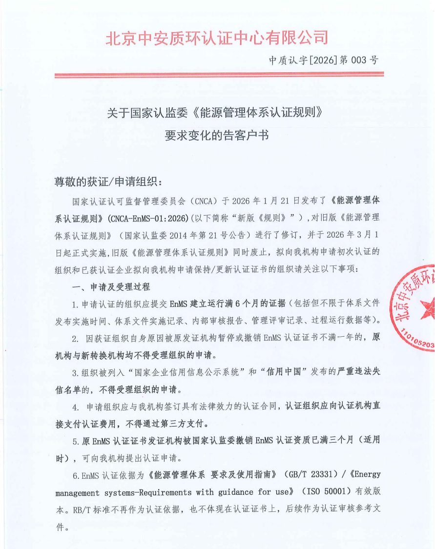 关于国家认监委新版《能源管理体系认证规则》要求变化的告客户书