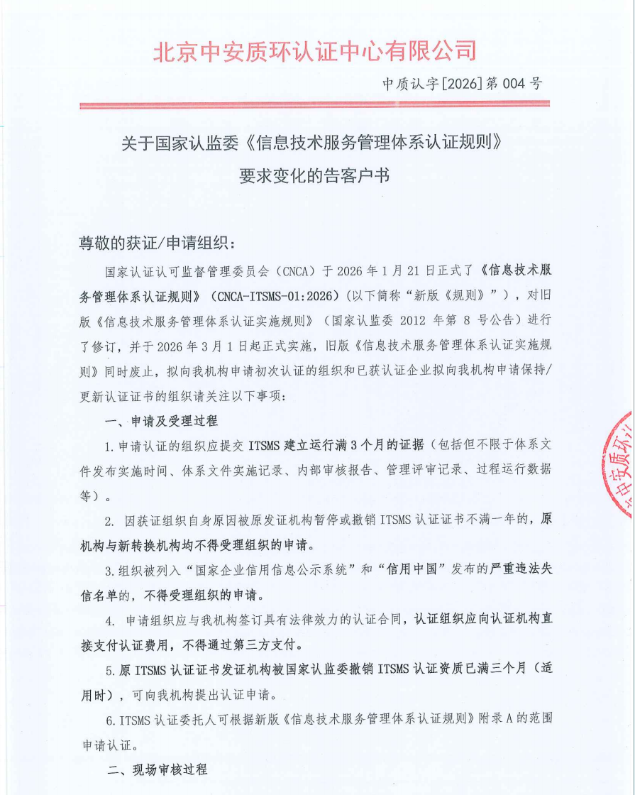 关于国家认监委新版《信息技术服务管理体系认证规则》要求变化的告客户书