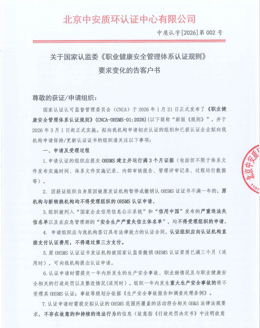 关于国家认监委新版《职业健康安全管理体系认证规则》要求变化的告客户书