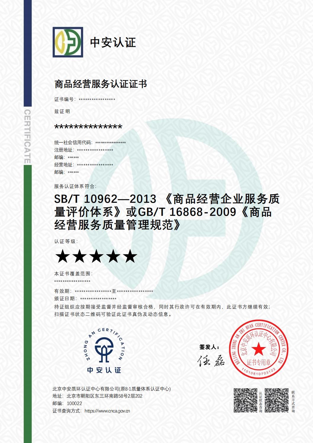 商品经营企业服务质量评价服务认证是由认监委批准的第三方认证机构,按照SB/T 10962-2013《商品经营企业服务质量评价体系》标准对申请企业的批发零售服务进行评价的第三方认证行为。认证结果依据分数分为三星、四星、五星,通过认证的企业可以按照认证的星级进行宣传推广,并合法使用认证星级标识。