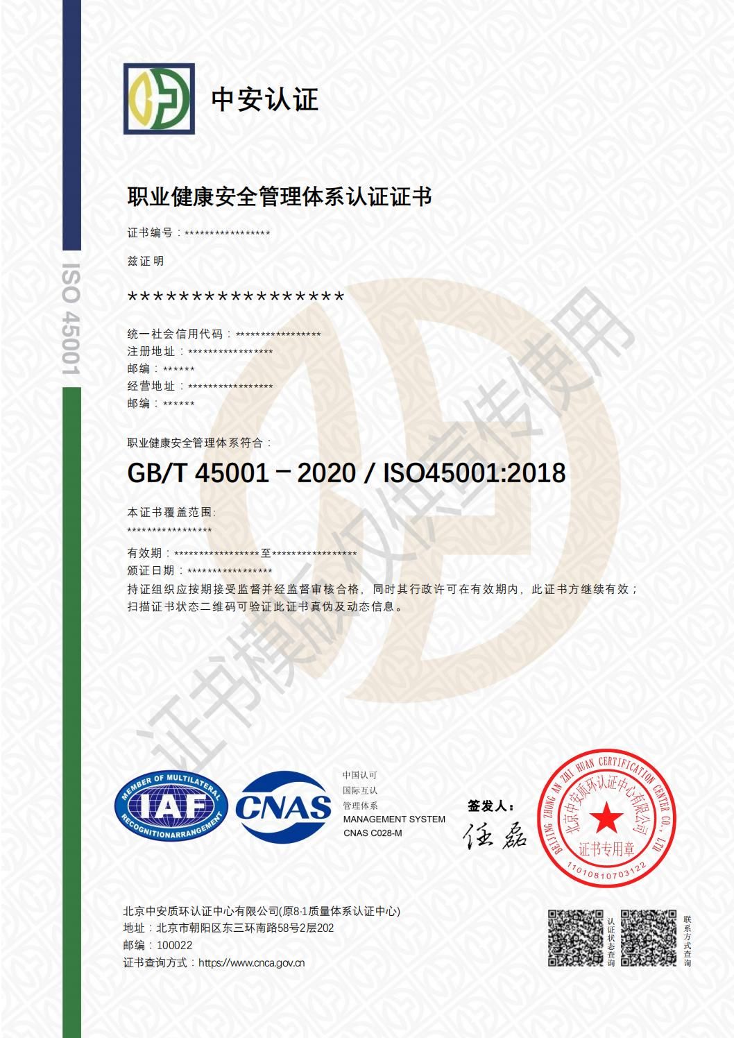 ISO 45001标准于2018年由国际标准化组织(ISO)正式发布,取代了原有的OHSAS 18001。是国际上继ISO9001质量管理体系标准和ISO14001环境管理体系标准后,世界各国家和地区共同关注的又一管理标准,可以帮助企业突破贸易壁垒,获得海外市场认可。
