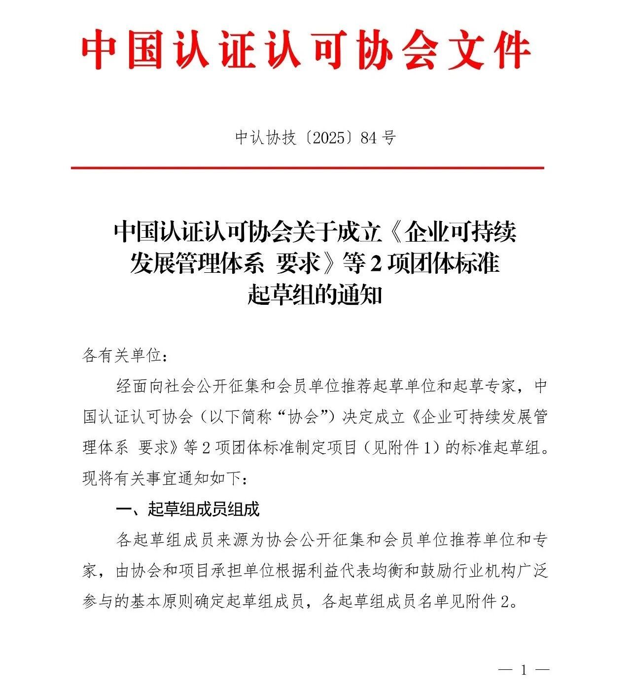 近日,中国认证认可协会(CCAA)发布关于成立《企业可持续发展管理体系 要求》等2项团体标准起草组的通知,并公布起草组成员名单。中安和谐集团旗下中安质环认证公司张淑梅、中水卓越认证公司刘娜、马双三位技术老师凭借扎实的专业功底与丰富的实践经验,成功入选相关标准起草组,后续将参与标准的编写工作。