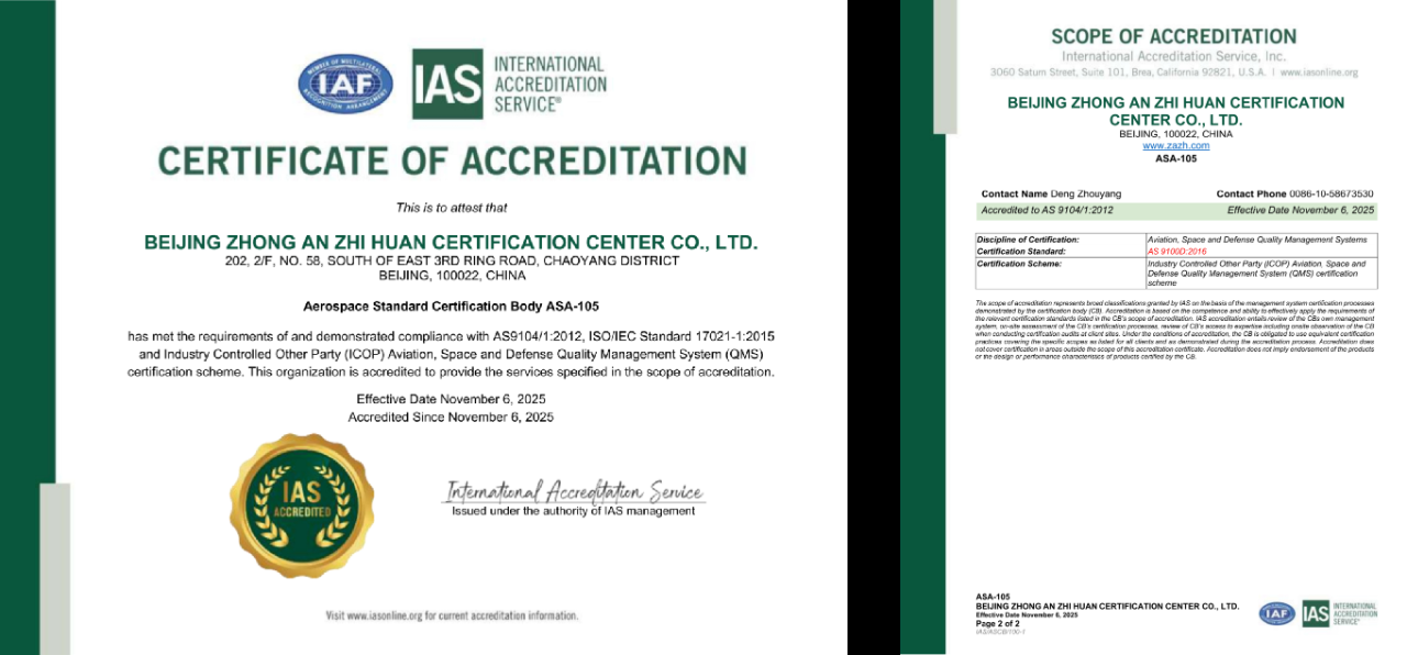 北京中安质环认证中心有限公司(ZAZH)于2025年11月6日获得了国际认可服务机构(IAS)颁发的 AS 9100 航空航天质量管理体系(AQMS)认可证书。是国内第二家获认可 AS 9100 的认证机构,这一里程碑成就为中国航空航天领域高质量发展注入强劲动力。